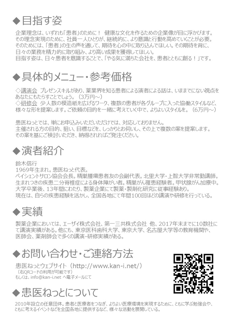 患医ねっとの代表は、まさにがんと闘っているプロフェッショナル患者。そして、生まれつきの身体障がい者。いのちやがんをテーマにした講演は、数知れず。ご期待に応えられることでしょう。