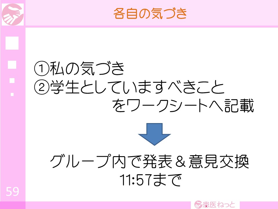 ・狙い「患者の視点をしる」「患者を「思いやる」の本質を学ぶ」「自分の将来像をより具体的にイメージする」「グループワークを体験する」 【参考情報】