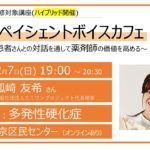 2025年11月20日 / 最終更新日時 : 2025年11月20日 kan-i-net-web イベントのお知らせ 【12/7ハイブリッド開催】第120回患者さんと薬剤師の対話の場「ペイシェントボイスカフェ」 ~多発性硬化症に罹患された方から〜 実施概要 イベント名 第120回ペイシェントボイスカフェ 開催情報 2025年12月7日(日) 19:00-20:30 開催場所 オンライン:ZOOMリアル:東京都文京区にて スピーカー 狐崎友希さん 疾患 多発性硬化症 […]
